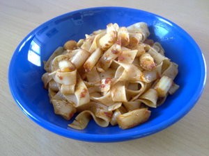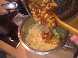 Vmes preglejte široke rezance, če so že kuhane in če so, lonec postavite na stran. |