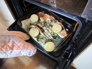 Počakajte 15 do 20 minut, da se oslič lepo zapeče in pekač nato vzemite ven.