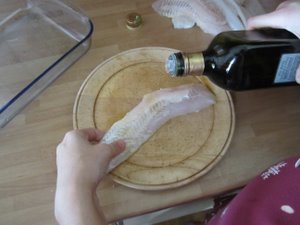 Postavite file osliča na leseno desko za rezanje in nanj polijte nekaj kapljic olivnega olja.