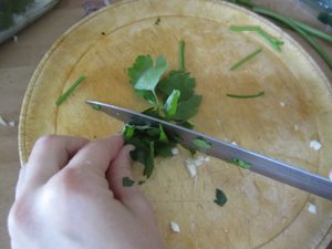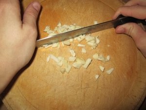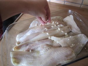 Prej nasesekljan česen nadrobite po filejih osliča.