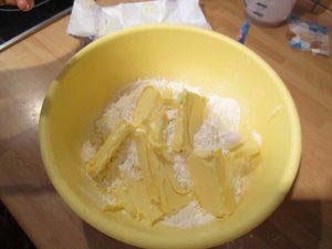 Narežite maslo na rezine in jih dodajte moki. |