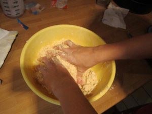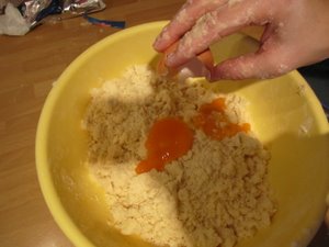 Sedaj z rokami zmanite moko in maslo v kašo. |