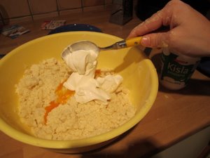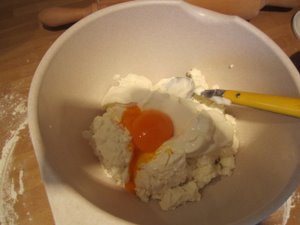 Ločite rumenjake in beljake še dveh jajc. Rumenjake dodajte skuti in smetani. |