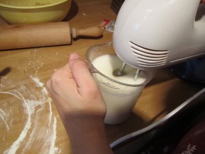 Vse štiri beljake prelijte v višjo plastično posodo. |