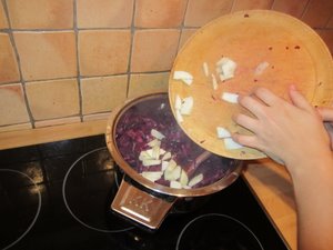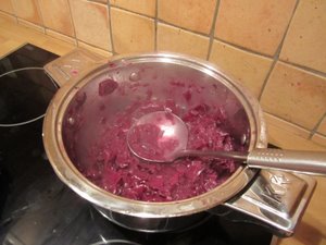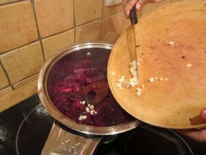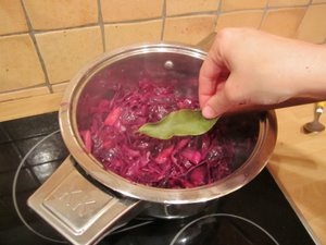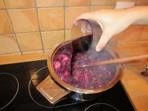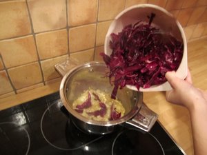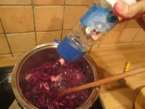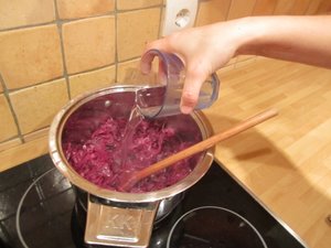 Ko tekočina povre dodajte še en kozarec vode in zelje dušite še naprej, dokler se ne zmehča, še pibližno 10 do 15 minut. |