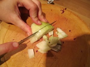 Vzemite čebulo, olupite rjave liste in odrežite zgornji in spodnji del, ter jo prerežite na pol. Narežite jo najprej na kolobarje nato še na majhne koščke. |