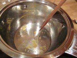 Pristavite na srednje visoko temperaturo. Olju dodajte žlico sladkorja. Sladkor mešajte dokler ne porjavi (kot vidite na sliki). |