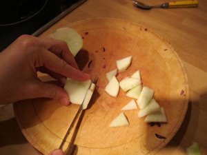 Nato pripravite jabolko. Jaz sem uporabila srednje veliko jabolko. Narežite ga na krhlje, pri čemer odstranite pečakti del. |