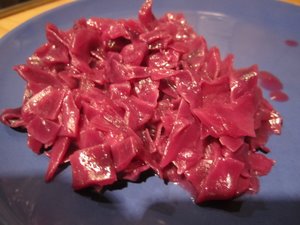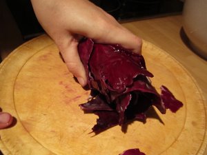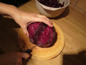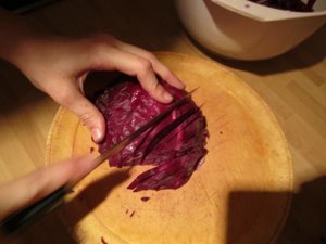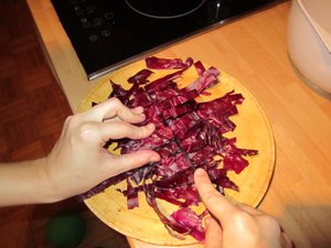 Sedaj "rolo" narežite na približno centimeter debele trakove. Zelje lahko narežete tudi zelo na tanko ali zeljno glavo kar naribate-stvar okusa. Te trakove lahko še prerežete po sredini, da jih skrajšate. |