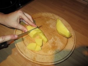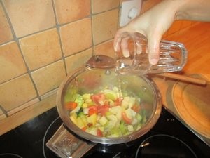Vse dobro premešajte in pražite še nekaj minut, potem pa vse skupaj zalijte z vodo (približno 3 velike kozarce). Premešajte in pustite kuhati na srednjem ognju približno pol ure oziroma dokler se krompir ne zmehča. |