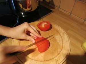 Sedaj umijte še paradižnik, ga narežite na manjše kose (glej sliko) in ga dodajte v lonec. |