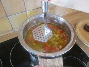 Ko je krompir dovolj kuhan (z lahkoto ga prebodete z vilico), vzemite pripomoček za tlačenje krompirja in vse skupaj dobro pretlačite, da bo vsa zelenjava v zelo majhnih koščkih.