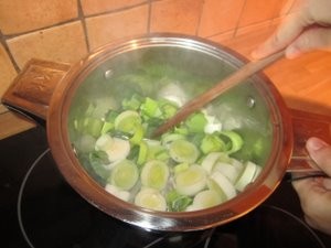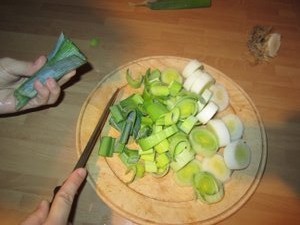 Vzemite por in ga umijte pod tekočo vodo. Narežite ga na kolobarje, kot vidite na sliki. Ko zrežete beli del, še enkrat temeljito sperite pod vodo zelene "liste" pora.