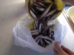 Vse pripravljene sardelce sem postavila v plastičen lonec. |