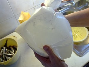 Vrečko dobro zavijte skupaj in jo potresite, da se bo moka dobra prijela na sardelce. |