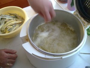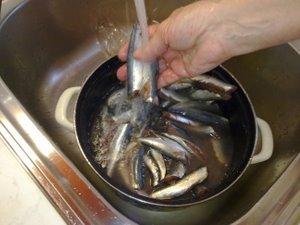 Potem sem vse sardelce postavila v večji lonec. In jih dobro z vodo tudi očistila. |