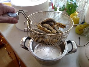 Ko je bilo olje vrelo, sem vstavila pripravljene sardelce in jih pekla okoli 10 minut. |