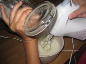 Očistite metlice mešalnika in zmešajte še beljake. |