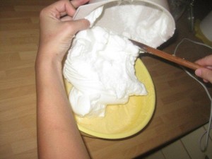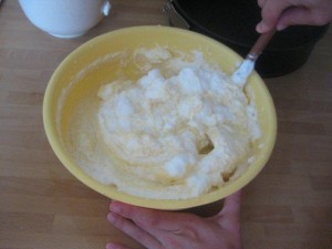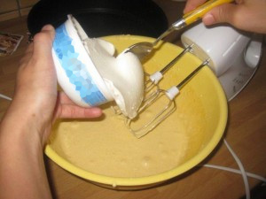 Ko je beljak dovolj trd (glej sliko), ga dodajte rumenjakom. |