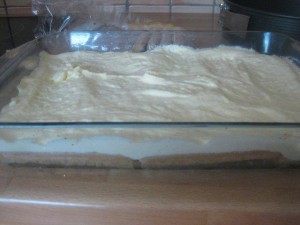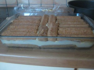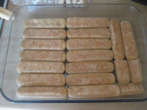 Nato na maso zložite še eno plast namočenih piškotov. |