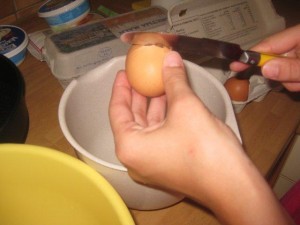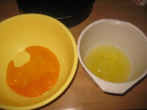Razbijte jajce in izlite beljak v višjo plastično posodo. Rumenjak pa v večjo plastično. |