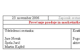 Predlagam vam, da si pred vsebino dokument shranite kot predlogo za vse prihodnje sestanke. Shranjujte zapisnike po kategorijiah (letu, oddelku...), da boste imeli urejeno "bazo". Seveda pa vam pri oblikovanju in urejanju ostajajo proste roke, saj sem vam pokazal le najbolj osnovni zapisnik sestanka. Dodajate lahko še mnogo stvari, ki se vam zdijo pomembne (naprimer: ime osebe, ki zapisuje zapisnik, uro sestanka....). |