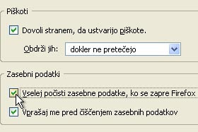 V polju zasebnih podatkov označite Vselej počisti zasebne podatke, ko se zapre Firefox. |