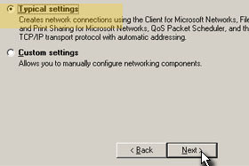 Pustite označeno Typical settings in potrdite na gumb Next. Izberite Custom settings, če želite nastaviti mrežne nastavitve takoj. |