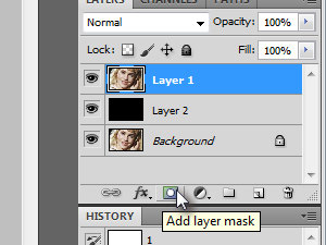 ![]() Zgornji layer naj bo označen in vi kliknite na Add layer mask (glej sliko). |
