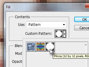 ![]() Kliknite zgoraj na Edit in izberite Fill... V novem oknu Use preko izbirnika določite Pattern in in nato izberite vzorec ki ste ga prej ustvarili (glej sliko). Kliknite na gumb OK. |