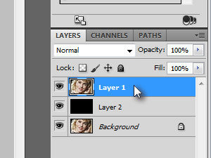 ![]() S tem ste zapolnili layer s črno barvo. Tega sicer ne boste videli, saj se nad njim nahaja še prej dupliciran layer z fotografijo. Označite nato zgornji layer.