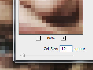 ![]() Kliknite zgoraj na Filter, Pixelate in izberite Mosaic... V novem oknu nastavite Cell Size na poljubno vrednost in potrdite na gumb OK. Poljubna vrednost sem zato napisal, ker je vse skupaj odvisno od velikosti vašega dokumenta. Vseeno si zapomnite nastavljeno vrednost. |