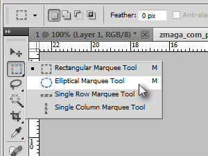 ![]() S tem ste ustvarili nov dokument, na katerega bomo dodali pikico. Izberite orodje Elliptical Marquee Tool. Držite z miško na orodju Rectangular Marquee Tool (bližnjica je tipka M) in prikazala se vam bodo nova orodja, kjer boste lahko izbrali Elliptical Marquee Tool. |