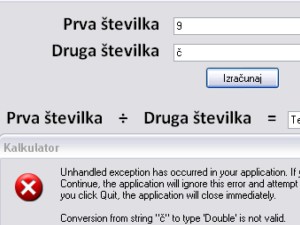 Catch ex As Exception TextBox3.Text = "Napaka" Label7.Text = "En vnos ni številka!" S to kodo bo program ujel izjemo, ko uporabnik programa ne vpiše številke in bo zato program uporabniku vrnil sporočilo o napaki. Če pa tukaj ni nobene izjeme, bo program vrnil pravilen odgovor. |