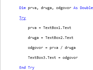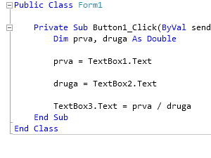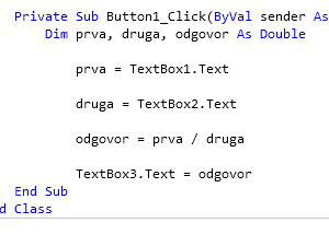 Prejšnjo kodo spremenimo v sledečo: Dim prva, druga, odgovor As Double prva = TextBox1.Text druga = TextBox2.Text odgovor = prva / druga TextBox3.Text = odgovor |