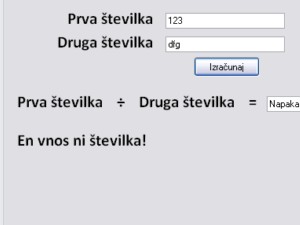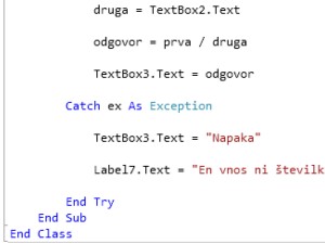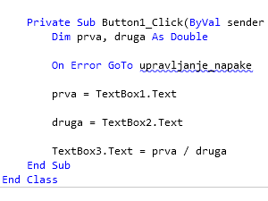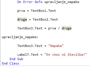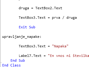 upravljanje_napake: TextBox3.Text = "Napaka" Label7.Text = "En vnos ni številka!" V prejšnjem koraku smo programu ukazali, naj ob napaki izvede kodo, ki je v upravljanje_napake. S prvo vrstico smo definirali upravljanje_napake.Z drugo in tretjo vrstico bo program uporabniku sporočil napako.