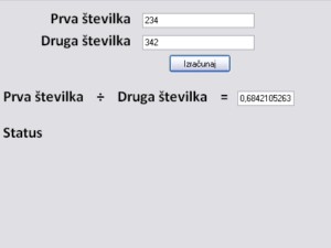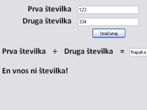Dim prva, druga As Double prva = TextBox1.Text druga = TextBox2.Text TextBox3.Text = prva / druga S to kodo smo programu samo dodali funkcijo deljenja.