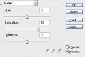 Pritisnite tipki CTRL + U, da odprete okno Hue/Saturation. Nastavite Hue 0, Saturation 50 in Lightness 0. Potrdite spremembe na gumb OK. |