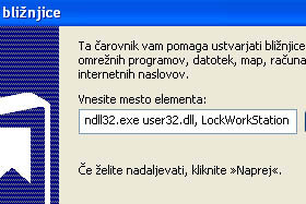 V mesto elementa vpišite %windir%system32 undll32.exe user32.dll, LockWorkStation in kliknite na gumb Naprej.