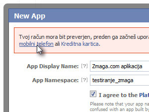 Odpre se novo okno, kjer v polje App Display Name vpište poljubno ime in v polje App Namespace neko drugo brez presledkov, posebnih znakov in šumnikov (glej sliko).