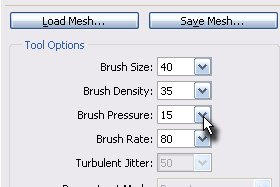 Na desni strani sem nastavil Brush Size 40, Brush Density 35 in Brush Pressure 15.