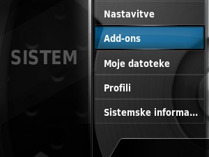 Za upravljanje razširitev se postavimo na opcijo SISTEM ter pritisnemo desno kurzorsko tipko, da odpremo podmeni Add-ons.