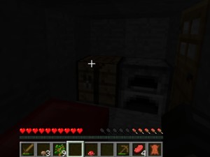 Sedaj pa naredite majhno votlinico v neki jami in tam notri postavite posteljo, peč in Crafting Table.