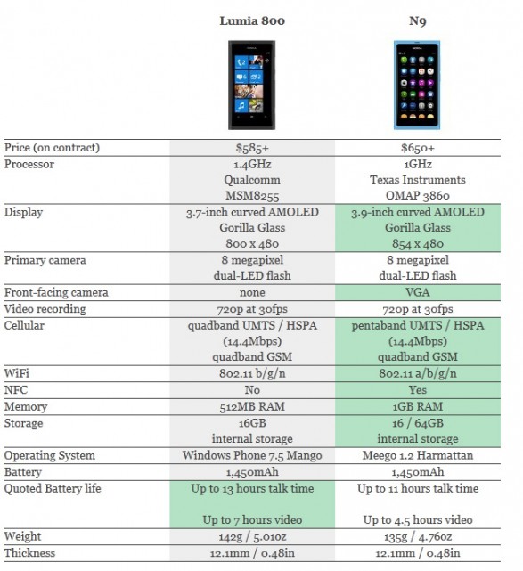 | Nokia je izpolnila obljube in še pred novim letom predstavila nove telefone z Windows Phone 7.5 oziroma Windows Phone Mango mobilnim operacijskim sistemom. Najbolj zanimiv je predvsem Nokia Lumia 800, ki ima podobno obliko kot njegov bratranec Nokia N9, le da bo zaradi dodatnih strojnih tipk imel 3,7 inčni zaslon, dodatno tipko za ustvarjanje fotografij (8 megapikslov) ter izboljšan 1,4GHz procesor. Imel bo vgrajenega 16GB notranjega spomina in dodatnih 25GB preko brezplačne Microsoftove storitve SkyDrive. Nokia je vložila veliko dela v novo platformo in med vsemi novitetami dodala tudi prvo glasovno vodenje na Windows Phone napravah.