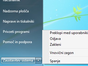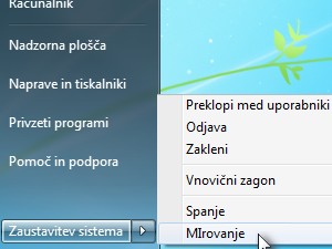 Če sedaj zopet kliknemo gumb Start in se postavimo na gumb Zaustavitev sistema, lahko sedaj opazimo novo možnost Mirovanje.