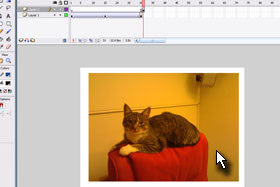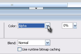 Označite v polju Timeline kvadratek (frame) pod številko 1, kliknite na sliko in spodaj v oknu properties določite Color Alpha in nastavite 0%.