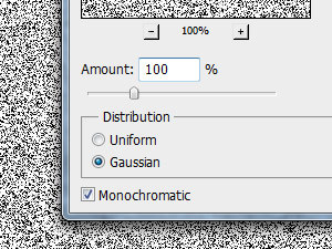Motnje v črno beli barvi smo dodali. Če ne bi pri koraku 2 nastavili kako drugo barvo, bi Photoshop te tudi uporabil. Dodali bomo delno zameglitev.