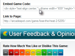 Če na spletni strani tega polja ne najdete, enostavno poskusite z drugo stranjo. Ko najdemo kodo igre, jo kopiramo. V moje primeru sem kodo našel na strani: http://www.arcadespot.com/game/lose-the-heat-2-5205/ |