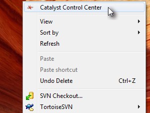 Najprej kliknemo prazen prostor na Namizju in izberemo Catalyst Control Center, da odpremo program za nastavitve grafične kartice.
