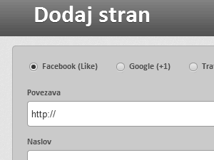 Nato izberete, katero stran želite dodati (Facebook, Google +1, spletno stran ali YouTube video posnetek). Dodate povezavo do strani, naslov strani in določite CPC (žetoni na klik). |